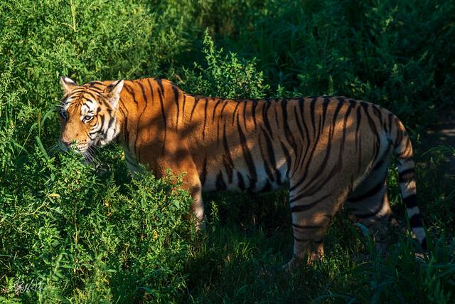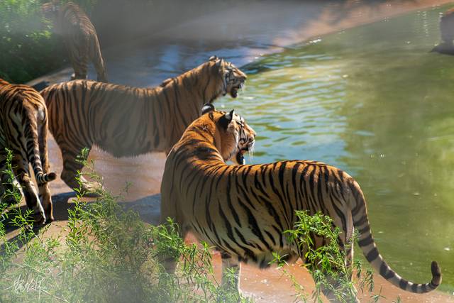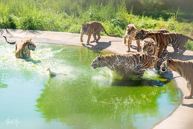 此时来了一辆绿色吉普车,林子里大部分老虎都跟在它身后,日常肯定都是由这辆车给它们带来了美食。我隔着铁丝网,看着老虎们在池子里进行了一场生死争夺,速度非常快,一只强者老虎已经抓到了鸭子。