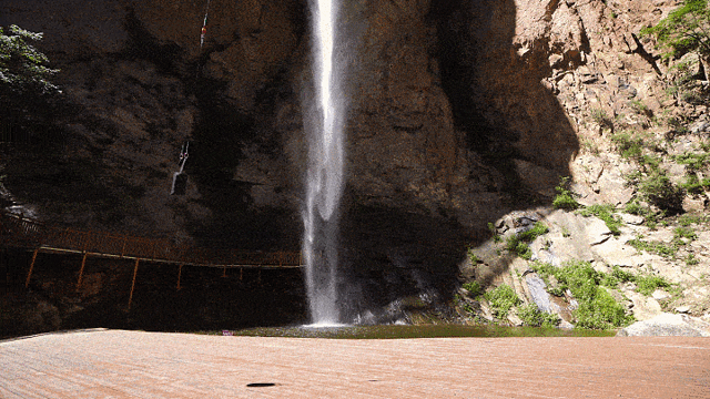 飞瀑后藏着一个神秘幽深的洞穴,穿过飞流直下的水帘,水滴如珍珠般滑落身上,当下只觉周身凉爽无比,所有注意力都在这种亢奋的情绪上,满是遇见18°的夏天的意外之喜。