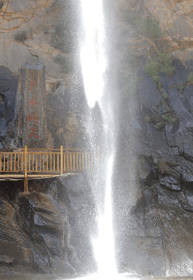 云雾缭绕之间,隐约可见一条银色瀑布从崖顶一泻而下,落差近百米,坠落石潭中,溅起无数水珠,犹如散落的珍珠般晶莹剔透。