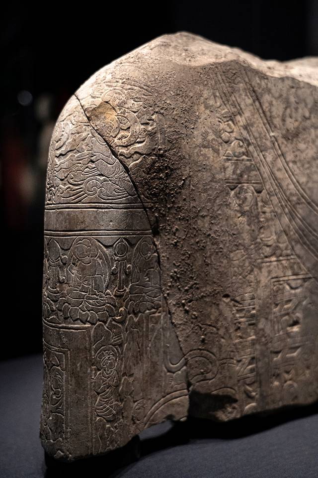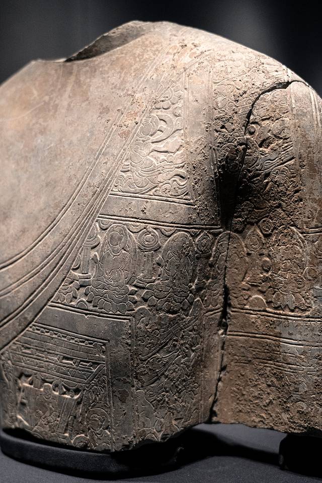 那些残损的背屏、断折的手指和碎裂的莲瓣,围簇着佛像穿透生命的眼神和笑容,好似白裙子上的一块蚊子血,曾在发掘之初让无数考古人员与文物爱好者遗憾不已。然而,很快他们便打消了这个念头。因为他们惊讶地发现,这些佛像在最初封存地下之时便已经处于缺损状态了。在出土碑刻上,这批佛像的身份被揭露出来:原来是宋代僧人为积累功德,收集了前朝的破损佛像,集中进行了掩埋。它们以不同的姿势品尝过失去的苦涩,却在千百年之后因这份残缺而散发出摄人心魄的光彩。