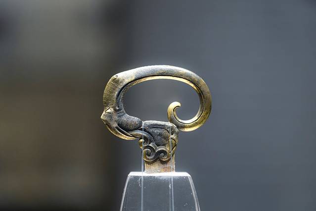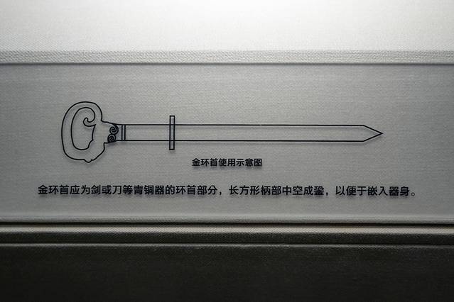 这居然是件金环首!剑身历经桑田,已锈蚀不见,只剩这只金环首,用金色的光泽诉说着它曾经的不可方物。难以想象这把剑的原型,究竟美到何种地步!