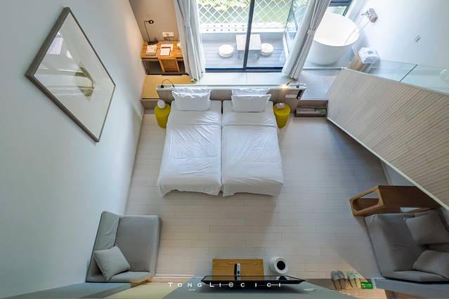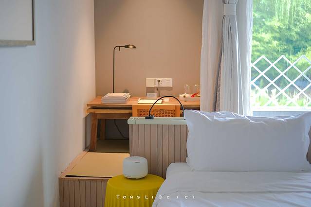 酒店的客房位于古风园内, 从客房名字“碧玉雅居”、”豆蔻雅居"和"花漾雅居",以及对应的色彩与材质元素就能看出酒店在讲述一个女子成长的旅程。客房以阳光灿烂的黄,学院的蓝,情窦初开的玫紫,纯真少女的米白色软布衬托,搭配淡色藤木缠绕编织出“丽则女孩”特有的雅居。典雅细腻的设计营造出无忧欢笑的轻松氛围,彷若当年青春年少的梦想空间。