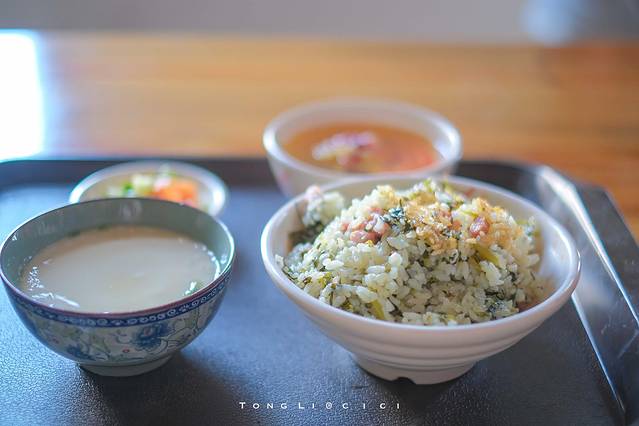 食堂里的“忆苦思甜”套餐,一份咸肉菜饭,配上排骨汤、炖蛋、小菜,品味那个激情燃烧的年代。