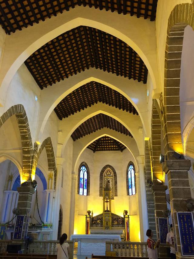 岛上有两个教堂,一个圣母教堂,一个天主教堂。圣母教堂属于私人开发,所以不含在上岛的门票里。天主教堂是岛上的主教堂,哥特式风格。是由巴黎传教士修建,落成于1880年。涠洲岛天主教堂位于涠洲岛盛塘村的天主教堂,掩映在一片绿影婆娑的芭蕉林和菠萝蜜树林中,是清末“雷廉”地区一座最为宏伟的教堂。重点推荐教堂的后花园,阳光正好的下午,花园在阳光下熠熠生辉,非常美。