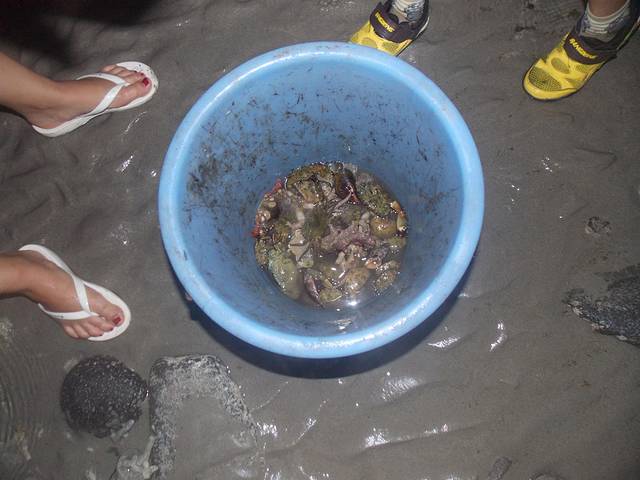 聊天的时候知道他们要赶海,我们就和他们一起,他们已经连续3年来涠洲岛玩,都住在小嘉这里,海钓、赶海是他们的必然项目。小嘉帮我们准备了手电筒、线手套、桶。赶海的时候才知道要像他们一样有更专业的装备才方便:矿灯(头灯),这样才能把双手腾出来,超厚手套,不会被螃蟹夹到手指。