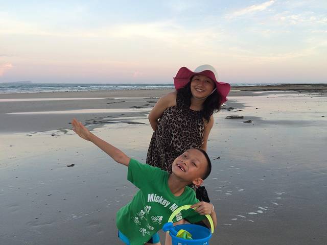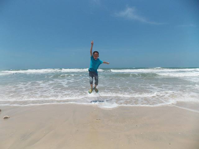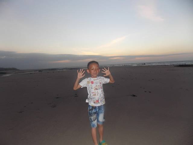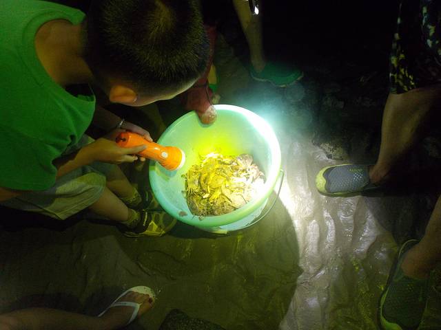 凌晨2:30起来,我们本想让儿子睡着不叫他,结果闹铃一响他比我们起的还快,还自己走完了近3个小时的路程,很厉害!我们手里要拿着手电筒,光线不强,看到螃蟹还没反应过来它们早跑了,哈哈哈
