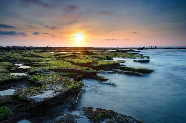 涠洲岛的东海岸沙滩,适合看日出,适合踩水发呆,适合拍漂亮的大片。这里有岛上最大的海蚀平台,焦红色的底色上衬托着碧绿的青苔,与碧海蓝天相呼应,阳光下格外耀眼,也因此得名五彩滩。
