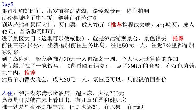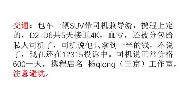 交通:包车一辆SUV带司机兼导游,携程上定的,D2-D6共5天接近4K,血亏,还被分包给私人司机了,司机说他只拿到一半的钱,不说了,现在还在12315投诉中。司机说正常价格600一天,携程店名 杨qiong(王京)工作室,注意避坑。