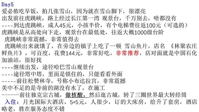 虎跳峡出来就饿了,在旁边的镇子上吃了一顿 雪山鱼片,店名 《林聚农庄鲜鱼片》,可百度,花费144元,非常好吃,非常推荐,店对面就是中国石化加油站,很好找