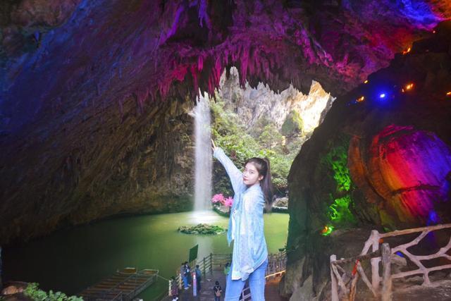 然后下午的时候就出发去体验天坑下可以游船的避暑胜地啦!首先我们怕错过船夫的工作时间,所以第一时间就选择了坐游船进去天坑溶洞里面了。进去之后,整个人都豁然开朗,真的被头顶上的天然天坑震撼到了,时不时还有飞鸟群飞过,生机勃勃。然后我们还经过了溶洞瀑布,清爽十足,不愧是避暑胜地。