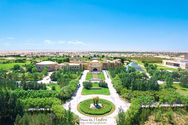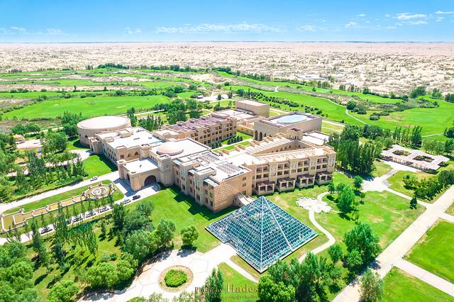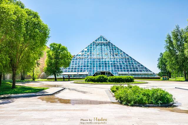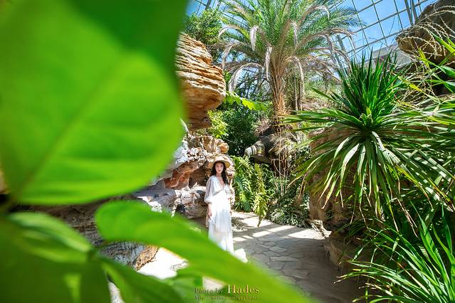 在黄沙围绕的景区之中,还有座酷似卢浮宫玻璃金字塔造型的植物园。这里一甩室外的干燥炎热,不仅湿润更是清凉爽快。午后待在里面顿觉神清气爽。
