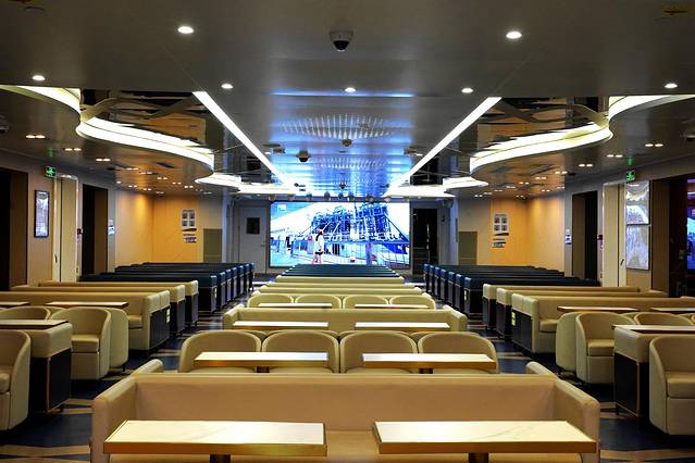 当登上邮轮,走进一楼船舱时,发现一楼大厅似一个小型影院,卡座宽敞且舒适。如果有游客在行船中感到身体不适,或是晕船的情况时,在此休息很是贴心。