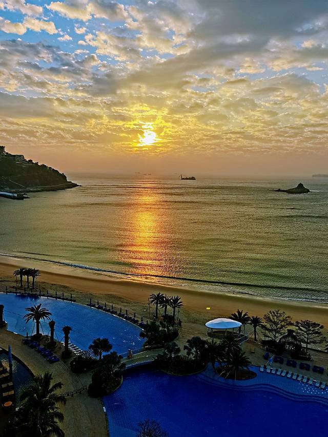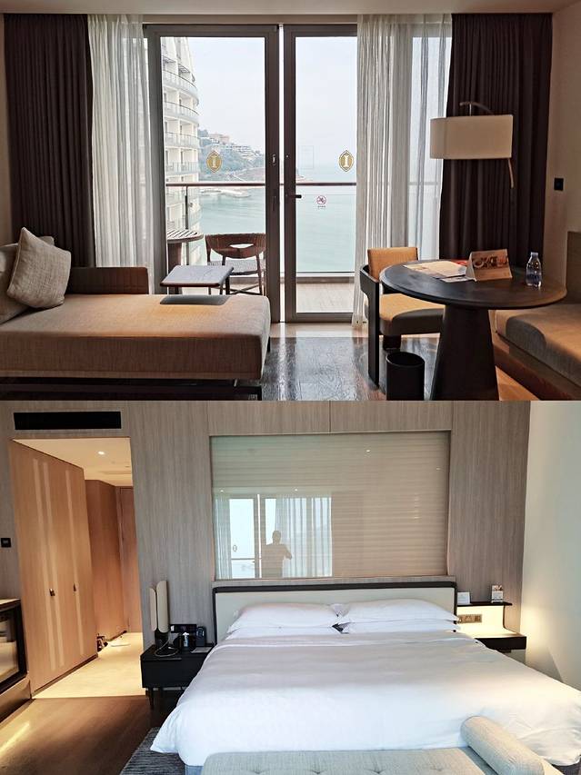 我们预定的是主楼的豪华海景房,9楼。房间很宽敞很整洁,卫生间也很干净,特别要说的是床居然直接对着阳台,躺在床上就可以看到无敌的海景,非常棒!不过电视机是在侧面的,有点新奇!