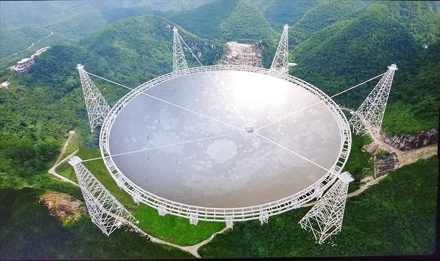 初次见面,好激动啊,从上往下看,天眼就像一口大锅,被群山簇拥着,伫立在周围的铁塔,通过绳索牵引着馈源舱悬浮在空中。流线型的外观与环绕的群山浑然一体,将这个有着世界天文奇观的现代科学设备,映衬地如此自然、和谐、美观。我想,这大概就是现代科学与唯美思维最完美的设计与表达。虽然无法亲拍,但能亲眼看看,也是一种荣幸了。