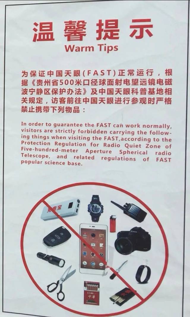 天眼欢迎你,但天眼不欢迎你的手机。因为天眼灵敏度极高,方圆五公里范围内被划归为电磁静默区,意味着参观过程不能用任何数码产品。需要在入园前把所有所有所有的电子电磁设备都放入景区电子储备箱。