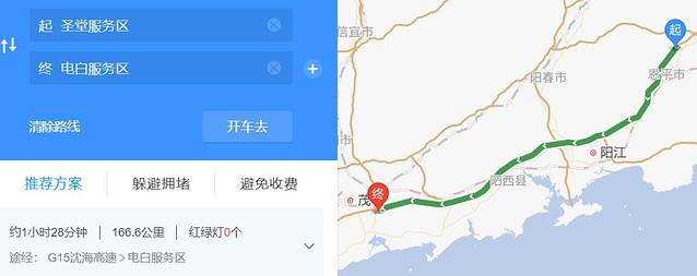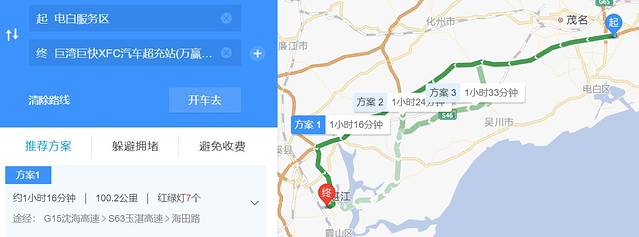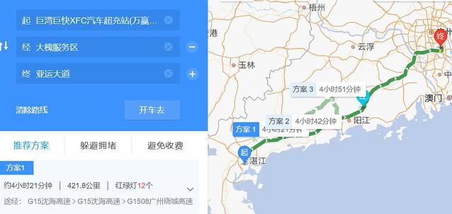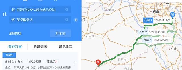 去程规划:广州番禺区巨湾巨快XFC超充站(马克新能源站)- 圣堂服务区 (156.5km)- 电白服务区(167km)- 湛江赤坎区(100.2km)