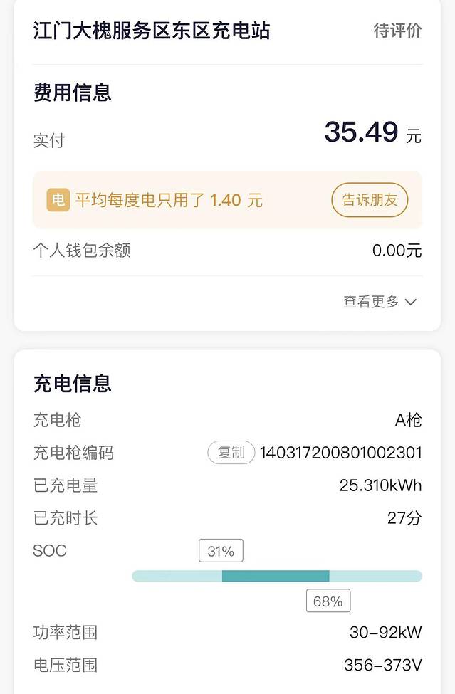 电费:峰期电价1.05元/度,服务费0.8元/度。充电19.22度实付35.6元。
