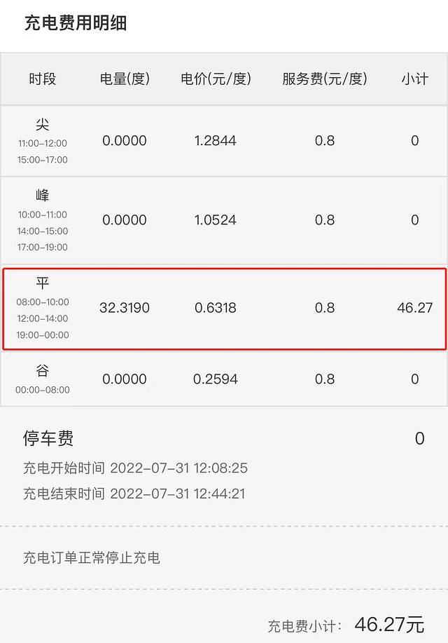 快充平期电价0.63元/度,服务费0.8元/度。充电32.32度实付46.27元。