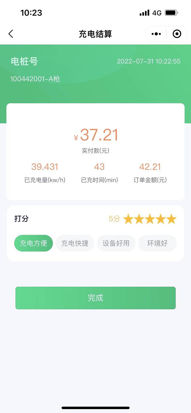 电费:超充峰期电价1.23元/度,服务费0.20元/度。充电39.43度实付37.21元。(使用了优惠券)