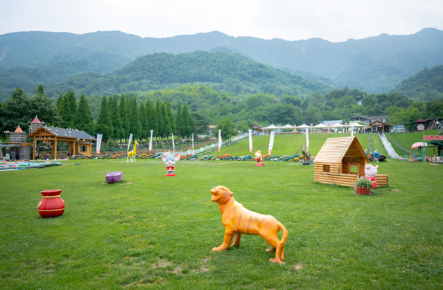 一进入滑草场内部,我们就看见了茂林似海的绿色植被,真是处处都充满了生机与希望,在空旷的草坪上,各种彩色的游乐设施与卡通在其中也更加惹眼。
