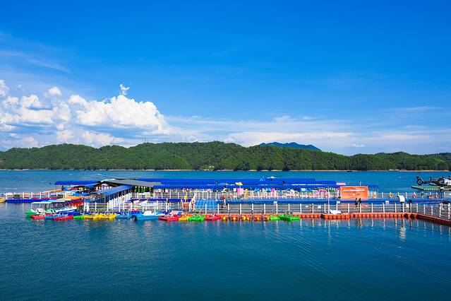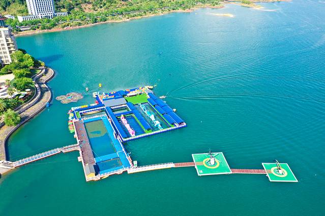 最后一天来到千岛湖希尔顿水上乐园玩水,炎热的夏天到水上乐园玩水最好不过了,让全身感受水带来的凉快。来了之后才发现这里可玩的项目真的是太多了。目前游水上项目有:动感游艇兜风、水上飞人、滑水冲浪、摩托艇漂移、水上沙发、水上飞鱼、水上陀螺、水上香蕉船(、皮划艇、浆板、休闲电瓶船、水上自行车、成人闯关竞技区、儿童冲关娱乐区、水上步行球等大小20多个项目。玩一天都玩不完,湖水真是清澈见底,在上面玩水是夏天最好玩的项目了。万万没想到的是,这里还有两架直升机。坐着直升机看千岛湖的景色更是不一样。
