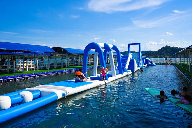 整个水上乐园是漂浮在水面上的,一进到水上乐园里面就看到好多家长带着孩子来体验水上项目。有说有笑的,很欢乐。买套票会比较划算一些,可以一次玩好几种,也可以单独买自己想体验的水上项目。