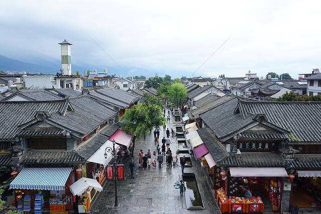 我们从城北开始踏上了小街只见得旁边的建筑别具风格,浓浓的纳西族风格的建筑,全为古朴的院落的民居,青瓦盖顶,木镂花窗别有韵味。五花石板在街道上延伸,只适合步行,每走几十步就会偶遇到台阶。走进四方街也能看见流水潺潺,河畔垂柳依依,街道都有涓涓细流,总觉得是在江南水乡之上,穿墙绕户,不过这里的人们还有一个习惯便是家家门口都会有一盆盆的鲜花将古城装饰成为花海一般,飘香四溢。