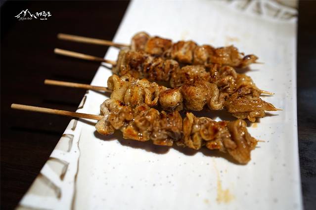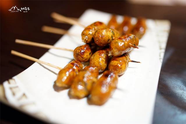 点了一份银杏串7500KWR、两份鸡皮串16000KWR、鸡胗串8500KWR、米肠8500KWR和一份芝士铁板,外加一杯扎啤,一杯饮料总计78500KWR