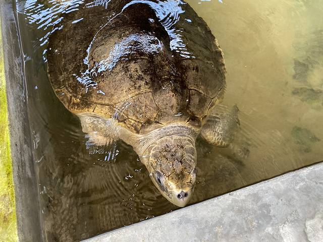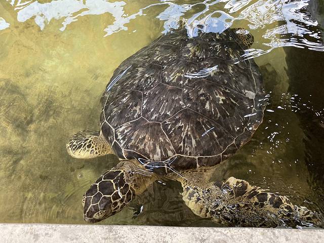 保育馆里会救助一些受伤的海龟,比如下面这两只都是因为环境污染被塑料缠身,导致一只手感染坏死被截肢,截肢以后的海龟不能保持平衡,会影响自主唤气和捕食,所以只能终身呆在狭小的水泥池里,接受人工喂养,侥幸存活下来。