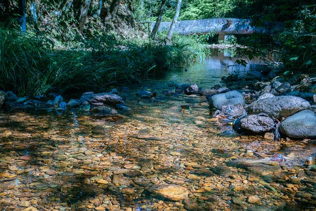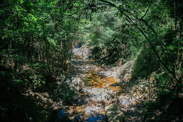 因为树木遮挡了不少阳光,所以并没有炎热的感觉。古道边的溪水无论从听觉还是触觉上都给人带来了一丝凉意,走得累了,舀一把溪水洗洗脸,浮躁一下子就消了。