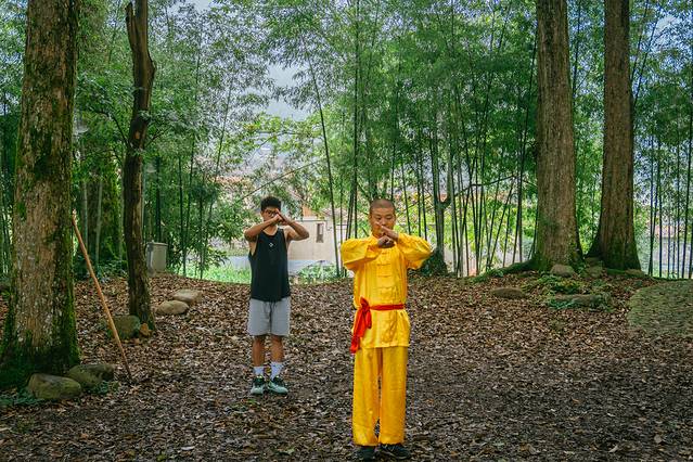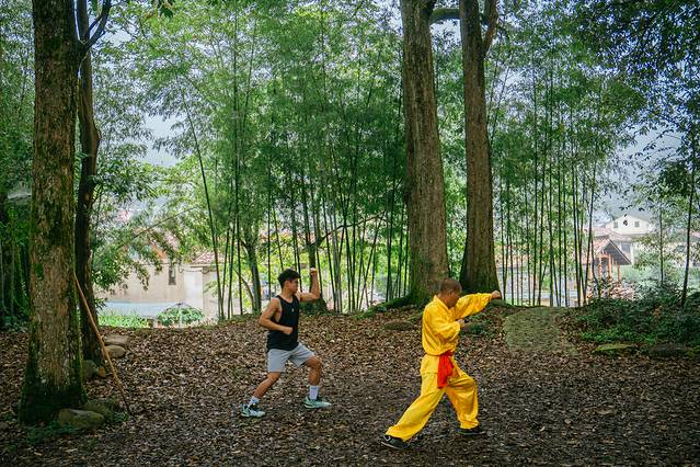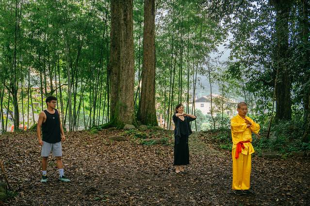 清晨8点,蓝老师喊我们去看古树林看茶园武术,今天的大师就是旗山侠隐的“万能队长”,也是遂昌茶园武术的第十一代传承人。其实茶园村村民的祖先是从福建迁移过来的,在融入新环境的时候都有一段阵痛期,所以为了抵御这里的流寇也为了护家,先辈们请了南少林的师傅传授武功就有了这套茶园武术。