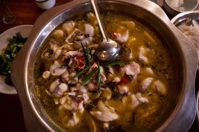 焦滩乡的村民世代居住在乌溪江边,对于鱼头的吃法可以说也是经过了千百年的启发、摸索与锤炼,逐渐成为当地的特色。焦滩鱼头用的是乌溪江的鲢鱼,大脑袋,肉质也鲜嫩,再配上自家做的豆腐和土生土长的蔬菜,把汤汁滚得浓浓的,再加点辣椒,一口一个鲜辣爽快。不吃辣也没关系,喝一碗熬成奶白色的纯鲜鱼汤,那本真的味道从舌尖流转到胃里,无论哪里都感到餍足。