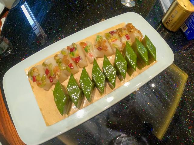 我查了一下绿色的叫做千层糕,口感爽滑软糯,带着一点清凉和筋道,甜而不腻。白色的为百果糕,糯米制成撒上了各种果脯和红绿丝做点缀,吃起来比较糯和粘,味道也更加的香甜,适合爱吃甜食的口味。