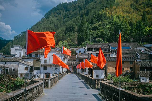 王村口是新四军挺进师粟裕打游击的大本营,所以又称为红军村,村口的桥上挂满了红旗,迎着风舒展得开,特别漂亮。有人说红色看多了会觉得烦躁,但是不知道为什么国旗的红和五星结合起来确是满胸腔的振奋。