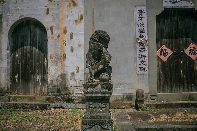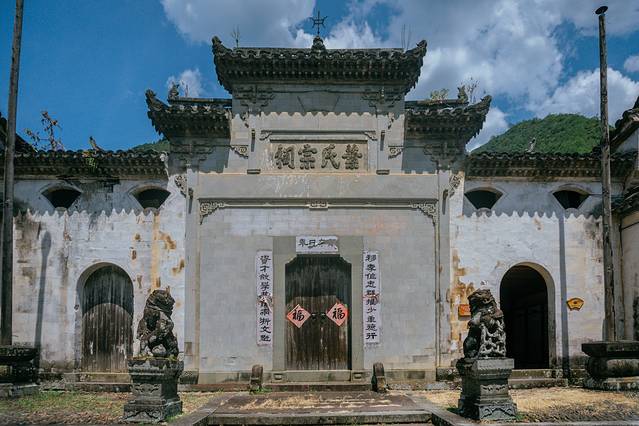 村中最为显眼的还是那一座叶氏宗祠。祠堂建于元末明初,歇山造顶,檐角翘起,二叠涩角出挑。正门前立着两头斑驳的石狮子,虽说长了青苔褪了色,但无论姿态还是气势依旧威严气派。叶氏宗祠总面宽近16米,进深43.47米,三进三开间,占地面积686.39平方米,足见彼时叶家之辉煌。