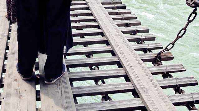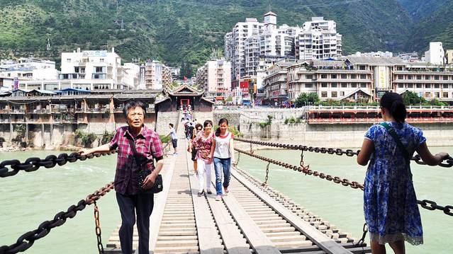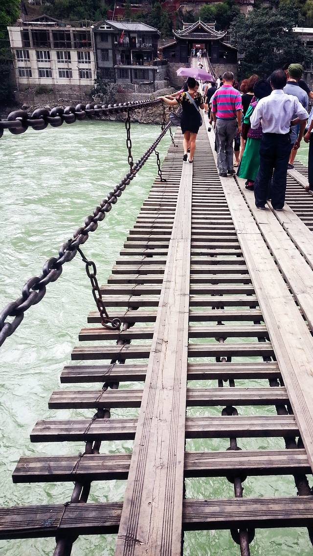 桥高88米,水深18米走在摇摇晃晃的铁锁桥上,从桥板的缝隙可以看见湍急的大渡河在下面奔涌而过让人心惊胆战。