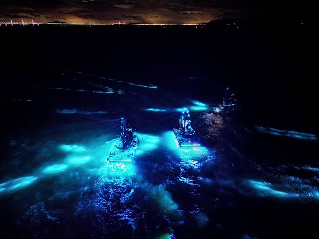和其他实景演出最不同的地方是《九洲船说·相约大海》以港珠澳大桥东南侧伶仃洋海域为背景打造的无边界剧场啦!观众的视觉半径达300米,舞台延展长度达1000米!“超广角”的视界带来不一样的“沉浸”体验!