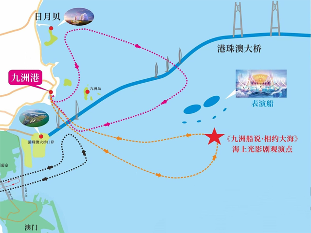 航线途径:九洲客运港——风帆桥塔——《九洲船说·相约大海》海上光影剧观影点——九洲客运港(开航时间以九洲客运港公布为准)