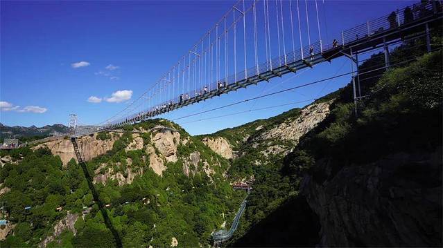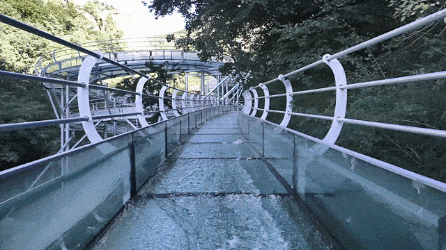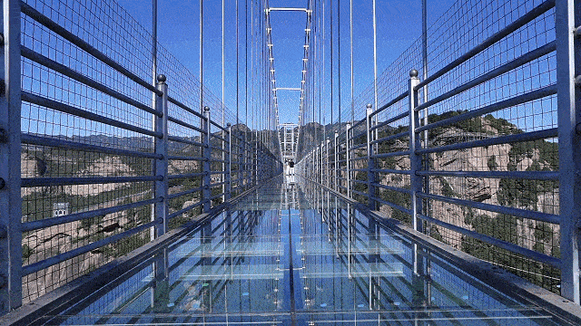 玻璃天桥横跨两山之间,全透明设计,有种“人在云端走,景在脚底游”的奇妙感受。漫步玻璃天桥,宛如置身于仙境,让人飘飘欲仙!在你赞叹于大自然鬼斧神工的造景能力时,还得鼓足勇气行走在百米高空,听着玻璃碎裂的声音,体验惊险与刺激。