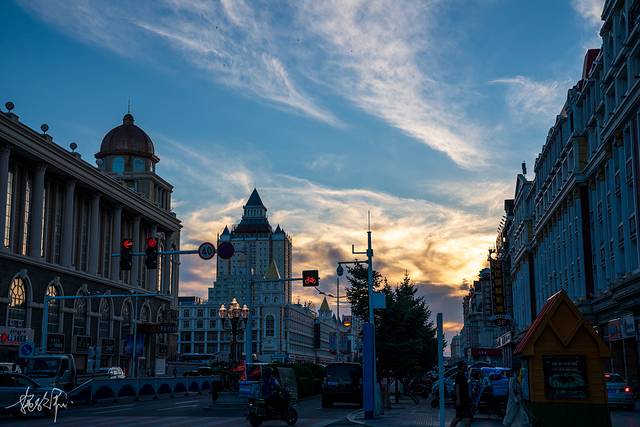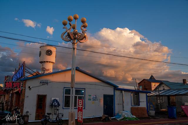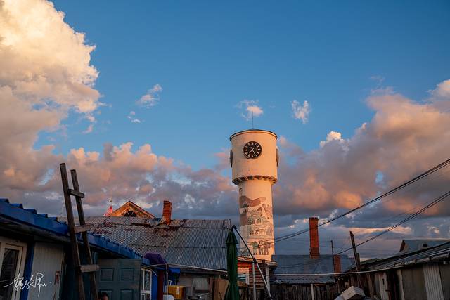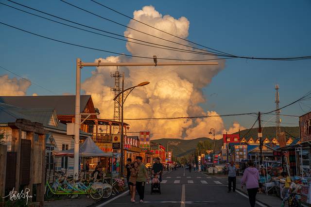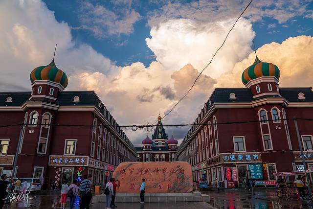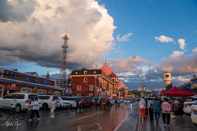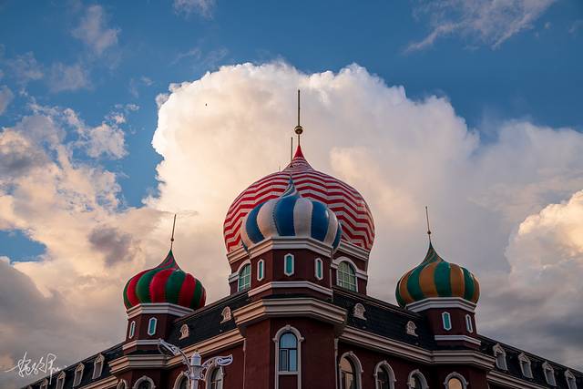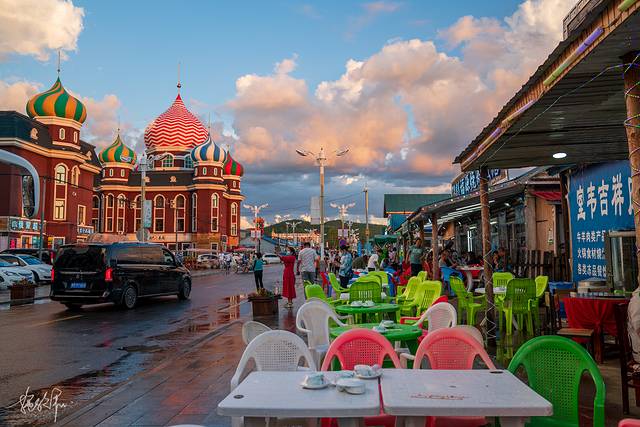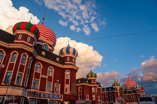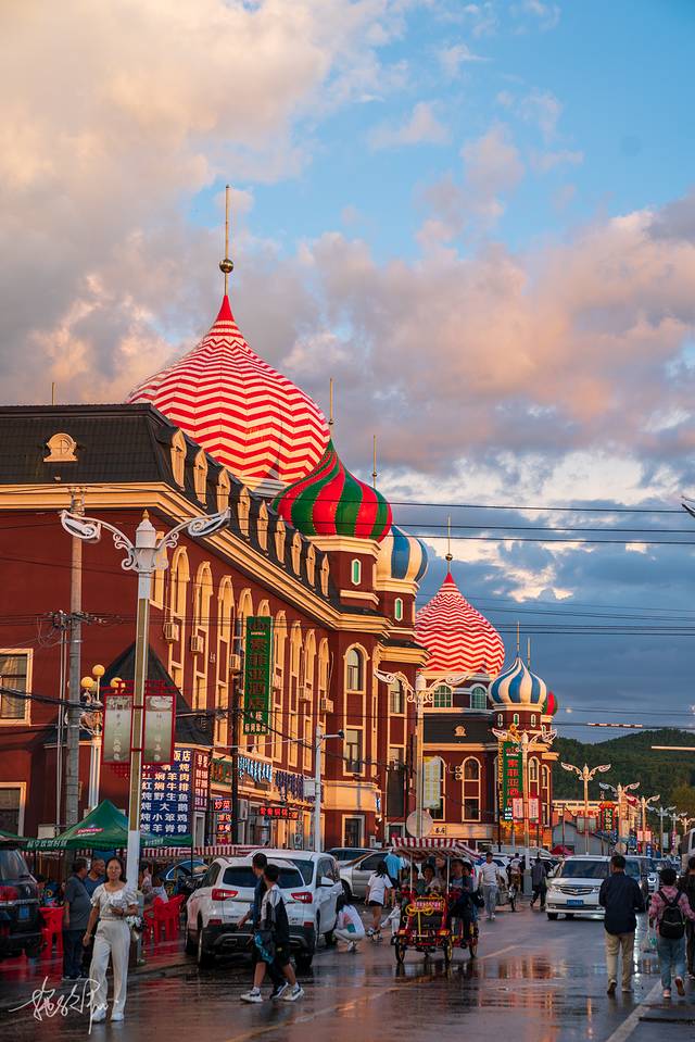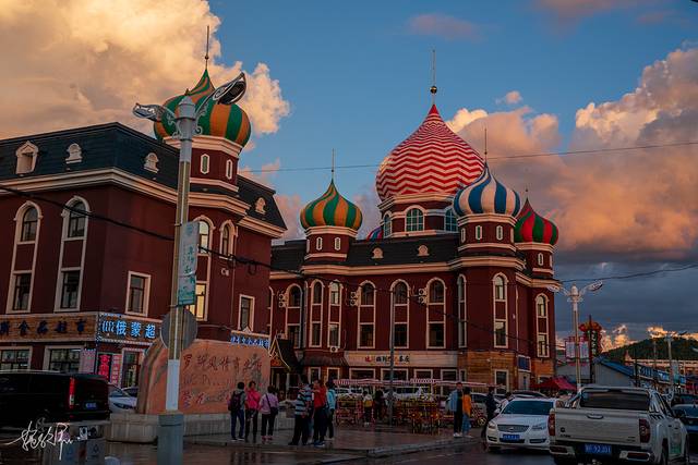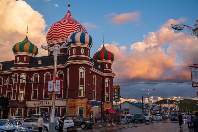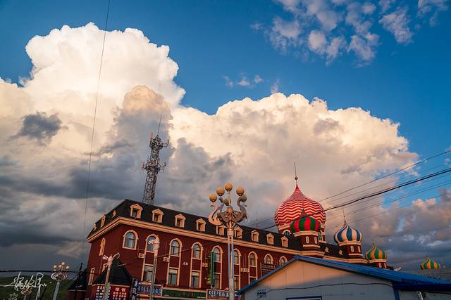 吃过晚饭,漫步在大街上,我们眼前的这个大穹窿圆顶是索菲亚酒店,旁边便是室韦的俄罗斯风情街。巧的是遇到了一场日落,让人心醉。远处的云朵粉粉嫩嫩,阳光温柔地打在了眼前这座美丽的小镇上。