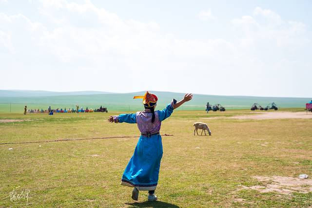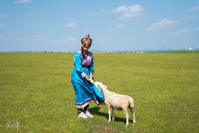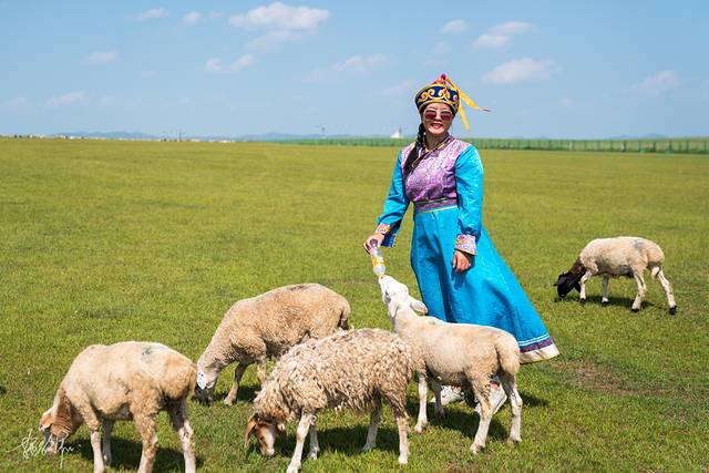 我也不例外,一一去试一下,选了一套蓝色的蒙古族服饰,飞奔在大草原之上,与羊群近距离接触,这一趟的呼伦贝尔之行,也算是做了一回蒙古族姑娘了。