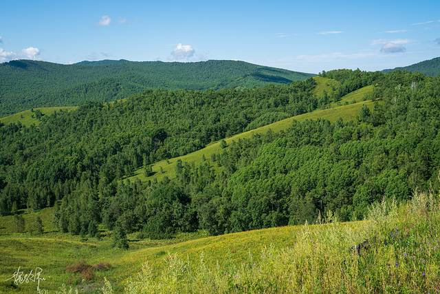 景区内就一条路,依次可以走过德都敖包、景区中心乞牙惕库伦,还有散落在四周的一些古老石雕。车子行驶在连绵的群山中,呼啸而过的一片片白桦林与此起彼伏的草原,夏天和秋天断然是不同风景的,如今遇到这个场景,说是在新疆也不为过。