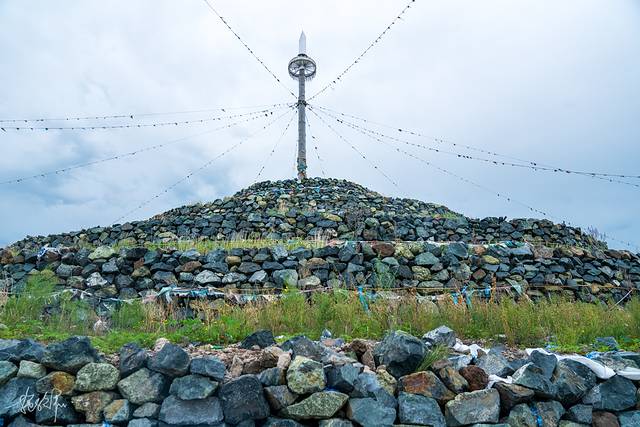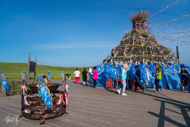 作为呼伦贝尔环线上的黄金目的地,186彩带河总是不容忽视的,乘坐着观光车来到山顶,眼前是一个巨大的敖包上面挂满了蓝色的哈达,这是内蒙古人民的风俗。