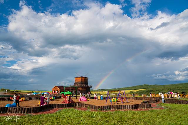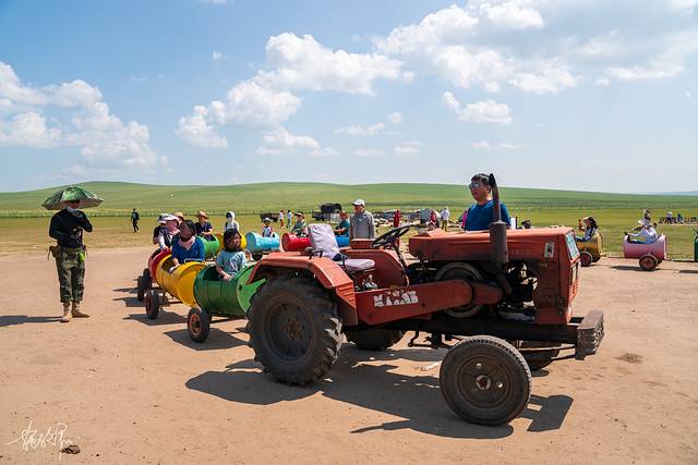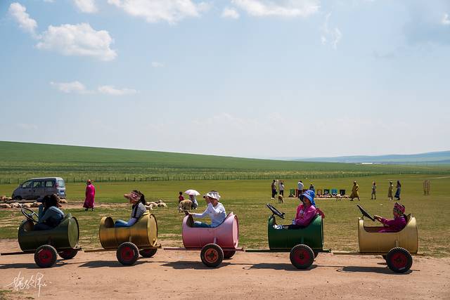 从室韦出发,一路美丽的大草原风光,第一站我们来到了草原上的牧民家。当地人们在这里打造了如同草原游乐园的感觉,在蒙古包里可以换自己想要的蒙古族服饰,然后在这里乘坐有名的网红小火车,喂养小羊,射箭玩耍。