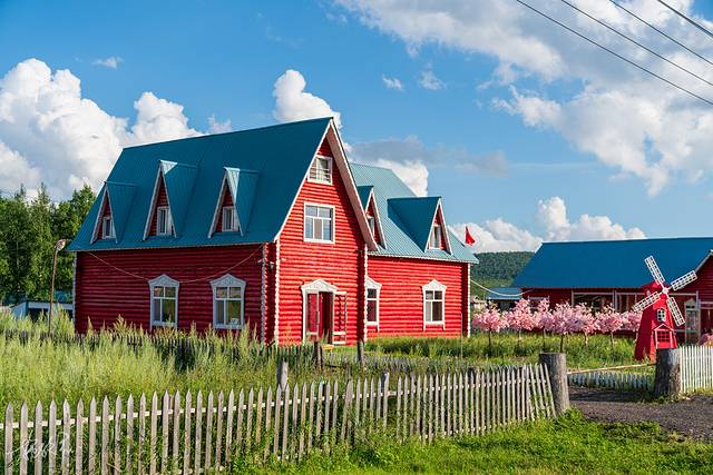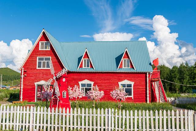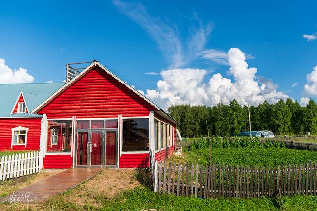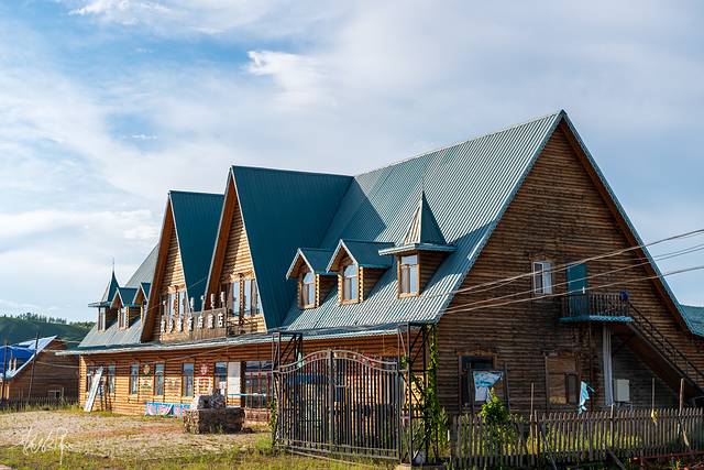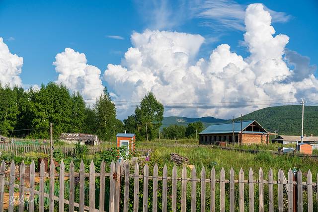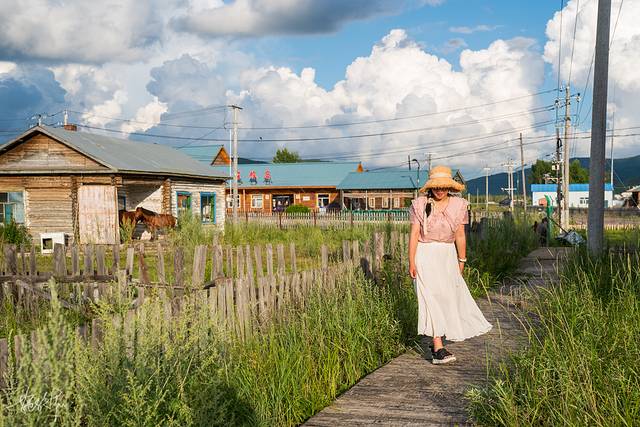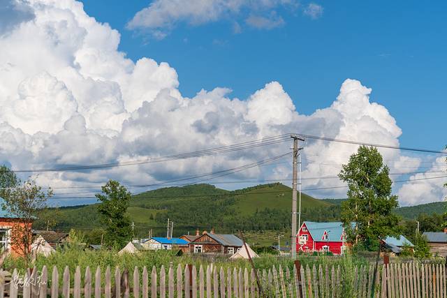路过莫日格勒河,穿越草原天路,我们来到了恩和。恩和小镇上到处都是有年月的木刻楞小木屋。下午时分,天气渐好,逐渐呈现蓝天白云,大朵大朵的棉花糖下是彩色系的篱笆小木屋,来呼伦贝尔的第一天,我感觉我已经值回票价了,20度的夏天、不刺眼的阳光、美丽的大草原和童话般的小镇。