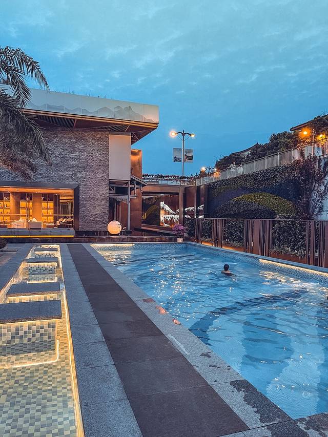 酒店地理位置非常好,坐落在河边,靠近报国寺,距离峨眉山游客中心更是只需要步行3分钟,酒店旁边市井十足,美食应有尽有,夜晚灯光亮起又是另外一番景象,另外酒店位置了观景台,健身房,餐厅,游泳池,温泉池,整体装修风格充满了山水艺术感,庭院式酒店,风格清雅,有亲自儿童乐园,从一进门开始就是一种享受!