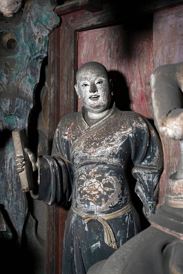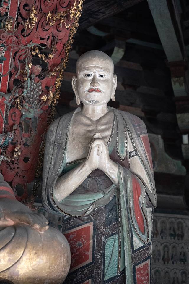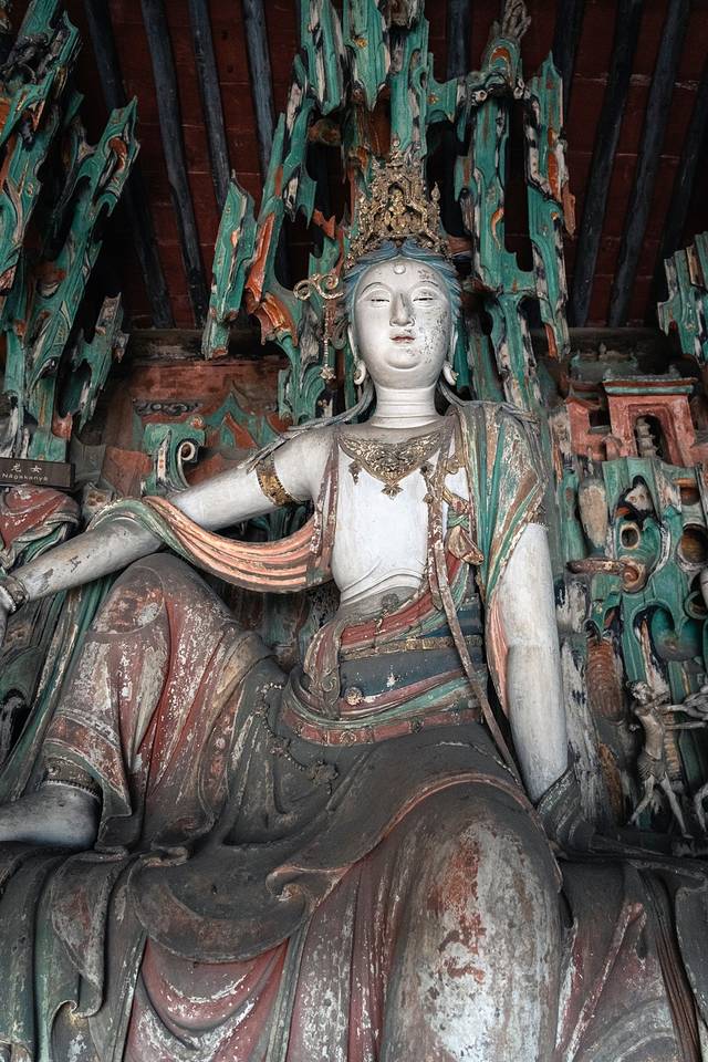 除去敦煌莫高窟,镇国寺万佛殿内的彩塑便是唯一留存的五代作品了。十四尊彩塑中,有三尊经历过重修与重塑,其余十一尊为五代原塑,距今已逾千年。丰满腴润的体态,画尽了唐风的灵秀飘逸之美。