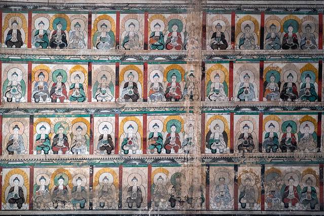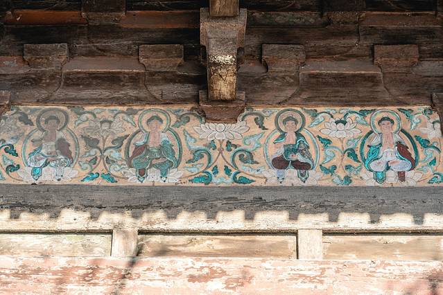这是怎样惊艳的一座大殿啊!远远地,已望见栱眼壁上一整圈的菩萨坐莲壁画,在日光的摩挲下显出某种远古时代特有的青色。大殿出檐巨大而深远,虽立在仅一砖高的石台基上,仍透出十足的磅礴气势。