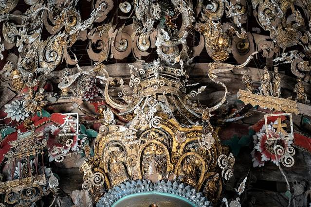 圆润的僧帽、圆润的“双下巴”、圆润的肚子,这尊几无棱角的罗汉本该充满喜感,却以略显犀利的眼神为这份圆滑补上了一角隐蔽的刚劲。这样的对比,为他赋予了浓厚的神秘感。他在隐藏什么秘密吗,亦或是发现了什么而在思索是否该对佛祖如实禀告?