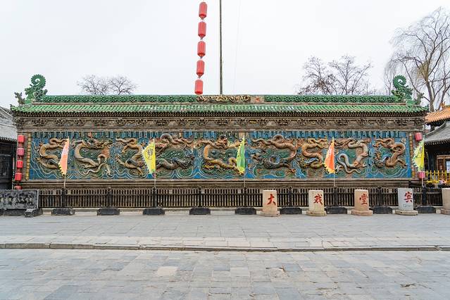 与梁思成对正定文庙大成殿的推断相同,平遥文庙大成殿原本也是佛教殿宇。它原属于太子寺,寺院倾颓后在原址建文庙。文庙背后,原太子寺山门照壁也摇身一变,成为了平遥古城著名的“琉璃九龙壁”。